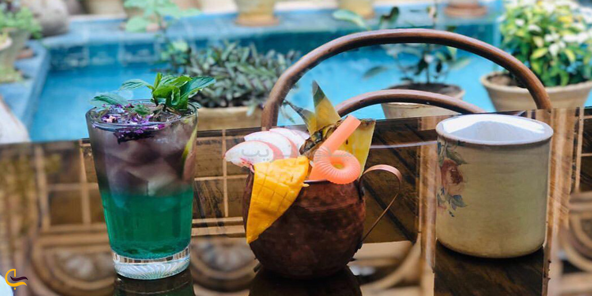 همان طور که اشاره کردیم، در دل این اقامتگاه یک کافه سنتی بسیار باصفا نیز وجود دارد. در ابتدا بهتر است کمی درباره فضای داخلی این کافه صحبت کنیم. کافه فیل شیراز از جمله کافه های شیراز است که دارای بخش سرپوشیده و فضای باز است. فضای باز در گوشهای از حیاط دلباز سرای فیل قرار دارد. البته معمولاً اگر کمی دیر بجنبید، میزهای فضای باز تکمیل میشوند. فضای سرپوشیده کافه نیز از نظر زیبایی کم از فضای بیرونی آن ندارد. این کافه محیطی دنج و دونفره را به مشتریان خود اختصاص میدهد. میز و صندلیهای کافه همگی چوبی هستند. همچنین سفارش مشتریان نیز داخل ظروف سنتی و نوستالژیک سرو میشود.