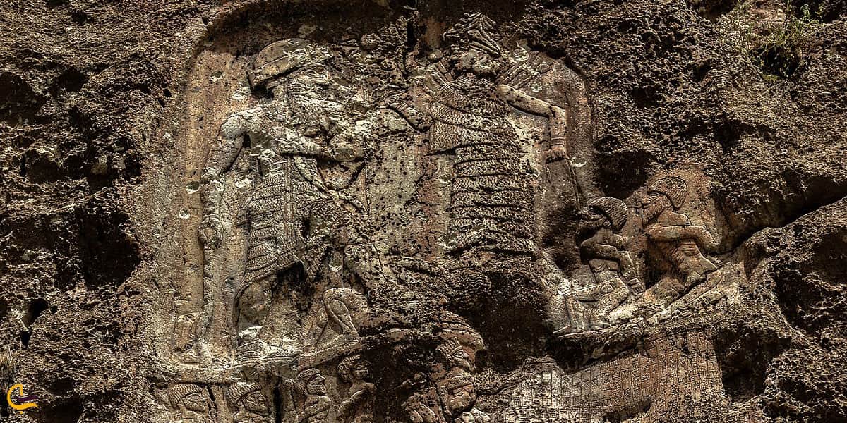 در این نقش برجسته، تصویر شاه در برابر ایزدبانو ایشتار به چشم میخورد. این کتیبه نشان میدهد که ستارهای باعث پیروزی پادشاه در برابر دشمانان شده است. پادشاه نیز پس از پیروزی، پای خود را بر پیکر بیجان دشمانان مغلوبشده نهاده. ملکه حلقهای در دست دارد و دست دیگر زنجیر یا طنابی گرفته است و دو اسیر در بند او هستند. در کنار شاه و ملکه، 90 اسیر برهنه در بند نیز به چشم میخورد.